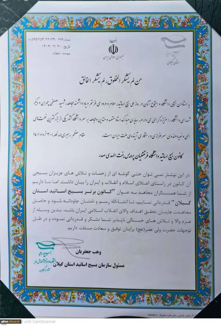 انتخاب کانون بسیج اساتید پردیس شهیده بنت الهدی صدر رشت به عنوان کانون برتر بسیج اساتید استان گیلان را خدمت خانواده بزرگ دانشگاه فرهنگیان استان گیلان خصوصاً بسیج اساتید این دانشگاه و به طور ویژه اساتید بسیجی پردیس شهیده بنت الهدی صدر رشت تبریک و تهنیت عر