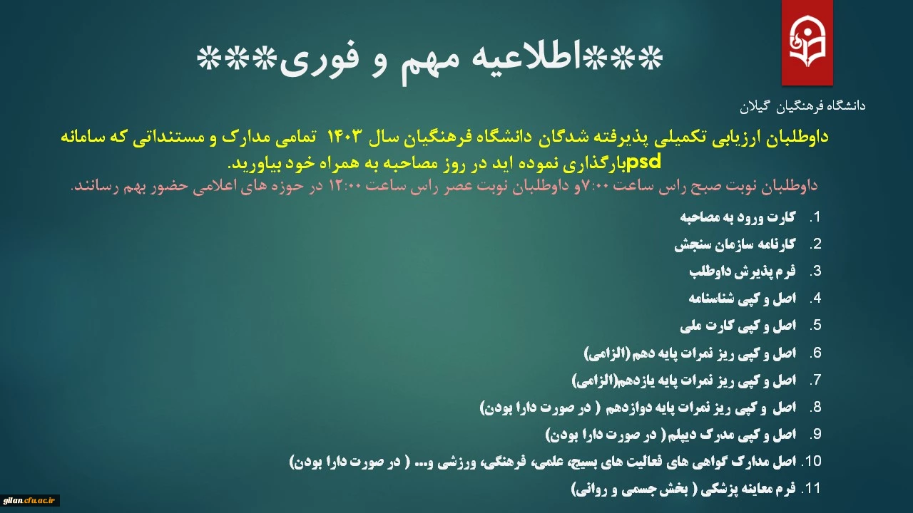 داوطلبان ارزیابی تکمیلی پذیرفته شدگان دانشگاه فرهنگیان سال 1403 تمامی مدارک و مستنداتی که سامانه psdبارگذاری نموده اید در روز مصاحبه به همراه خود بیاورید. 2