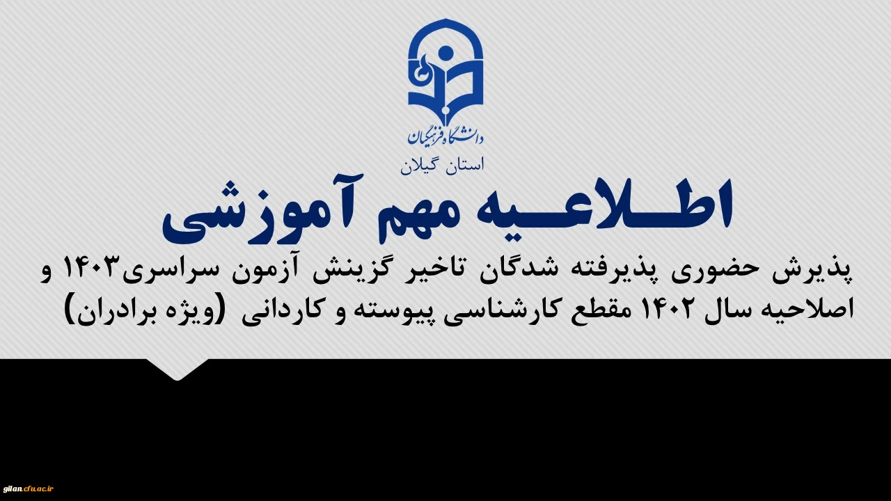اطلاعیه مهم آموزشی پذیرش حضوری پذیرفته شدگان تاخیر گزینش آزمون سراسری1403 و اصلاحیه سال 1402 مقطع کارشناسی پیوسته و کاردانی (ویژه برادران) 2