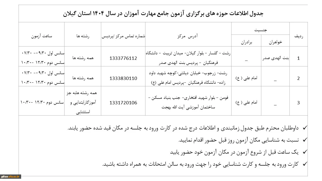 جدول اطلاعات حوزه های برگزاری آزمون جامع مهارت آموزان در سال 1404 استان گیلان 4